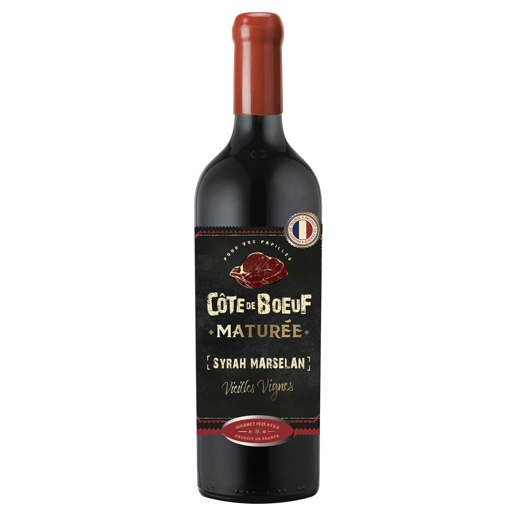 Wine IGP Pays d'Oc Red Cote Boeuf Maturee Syrm 14.5% is a bold, full-bodied red wine that celebrates the character of Southern France. Produced in the renowned Pays d'Oc region, this Syrah-based blend showcases exceptional richness and complexity.
